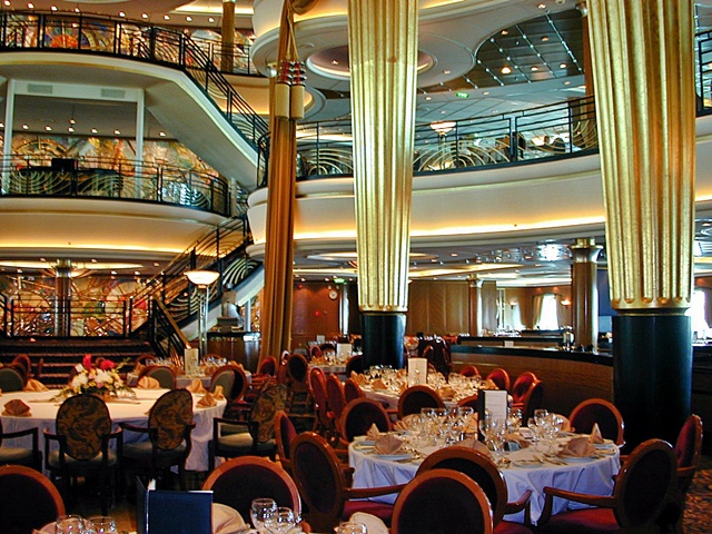 Below the Royal Promenade is an immense casino - and there's a two story disco called, "The Chamber" festooned with medieval suits of armor and gargoyles- a fantastic late night destination. There's the three story theater up at the bow featuring RCCL's typically very entertaining shows, but there's also the ice skating rink on another deck that has two exquisite shows during the 7 day cruise (GET TICKETS for this show as soon as they become available). Aft is the three story main dining room- very beautiful in it's appointments, but there's also the incredibly upscale and reservations only "Portofino" Italian restaurant that's a bargain at a mere surcharge of $20/person. (Expect to pay 5 times that to eat at such an upscale restaurant in the real world). There's also Johnny Rockets serving up burgers, dogs and malted milkshakes- and of course the line's venerable buffet location, the Windjammer (also called the Island Grill) Cafe. Needless to say, you'll never have a hard time finding something to eat on this ship (or any other respectable cruise ship- but this one has food options everywhere).